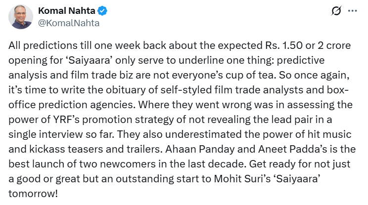 ट्रेड एक्सपर्ट कोमल नाहटा एक्स पर लिखते हैं कि फिल्म की छप्परफाड़ ओपनिंग के लिए तैयार रहिए।