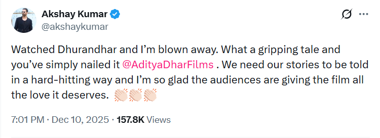 ध्यान देने वाली बात यह भी है कि अपनी पोस्ट में अक्षय ने सिर्फ आदित्य धर का नाम लिया है। उन्होंने रणवीर सिंह या किसी अन्य कलाकार के अभिनय को लेकर कुछ नहीं कहा।