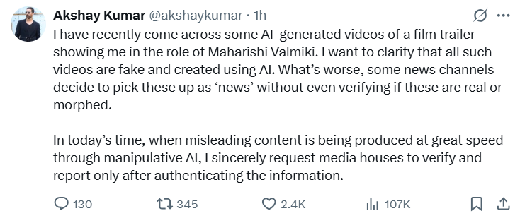 मंगलवार को अक्षय ने एक्स पर इस बारे में सूचना देते हुए लिखा- हाल ही में मुझे पता चला है कि किसी फिल्म के एआई से बने ट्रेलर में मुझे महर्षि वाल्मीकि के किरदार में दिखाया गया है। मैं साफ करना चाहता हूं कि ऐसे सभी वीडियो फर्जी हैं और एआई से बनाये जा रहे हैं।