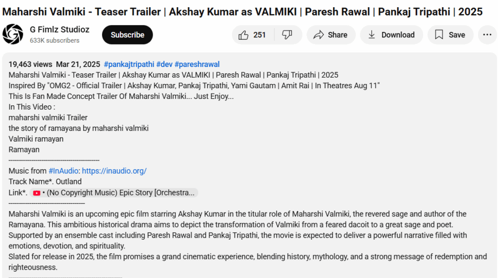 इस थम्बनेल को इतनी सफाई से बनाया गया है कि असली लगे। अंग्रेजी शीर्षक में लिखा है- महर्षि वाल्मीकि के किरदार में अक्षय कुमार और दायीं और ऊपर कोने में टी-सीरीज का लोगो भी बनाया गया है।