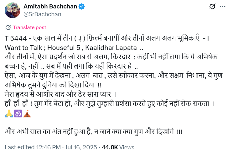 अमिताभ ने इसी के मद्देजनर एक्स पर लिखा- एक साल में तीन फिल्में बनाईं और तीनों अलग-अलग भूमिकाएं- आइ वान्ट टू टॉक, हाउसफुल 5, कालीधर लापता। और तीनों, ऐसा प्रदर्शन, जो सबसे अलग, किरदार। कहीं भी नहीं लगा कि ये अभिषेक बच्चन है, नहीं। सब में यही लगा कि यही किरदार है।