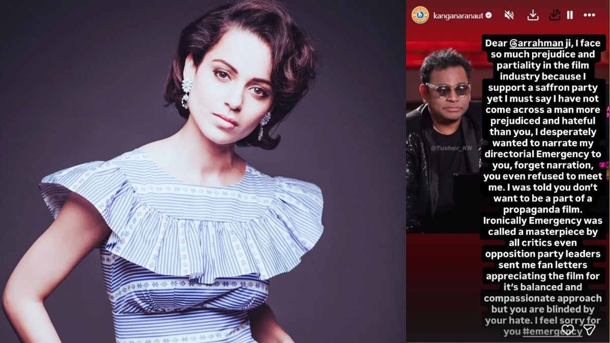 कंगना रनौत: अभिनेत्री कंगना ने रहमान को ‘पूर्वाग्रही और घृणित’ बताया। उन्होंने इंस्टाग्राम पर शेयर किया कि अपनी फिल्म ‘इमरजेंसी’ के लिए रहमान से मिलने की कोशिश की, लेकिन उन्होंने मिलने से इनकार कर दिया और इसे ‘प्रोपगैंडा फिल्म’ कहा। कंगना ने कहा कि आप अपनी नफरत में अंधे हो गये थे।