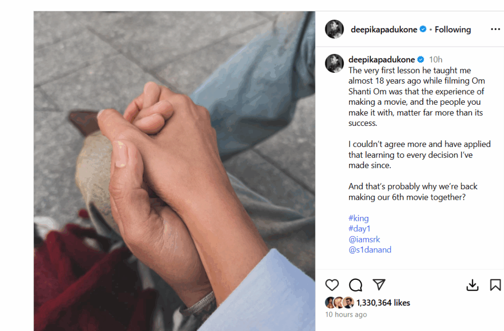एक्ट्रेस ने एक तस्वीर शेयर की है, जिसमें एक-दूसरे में गुंथे दो हाथ नजर आ रहे हैं। सम्भवत: एक शाह रुख का हाथ है और दूसरा दीपिका का।