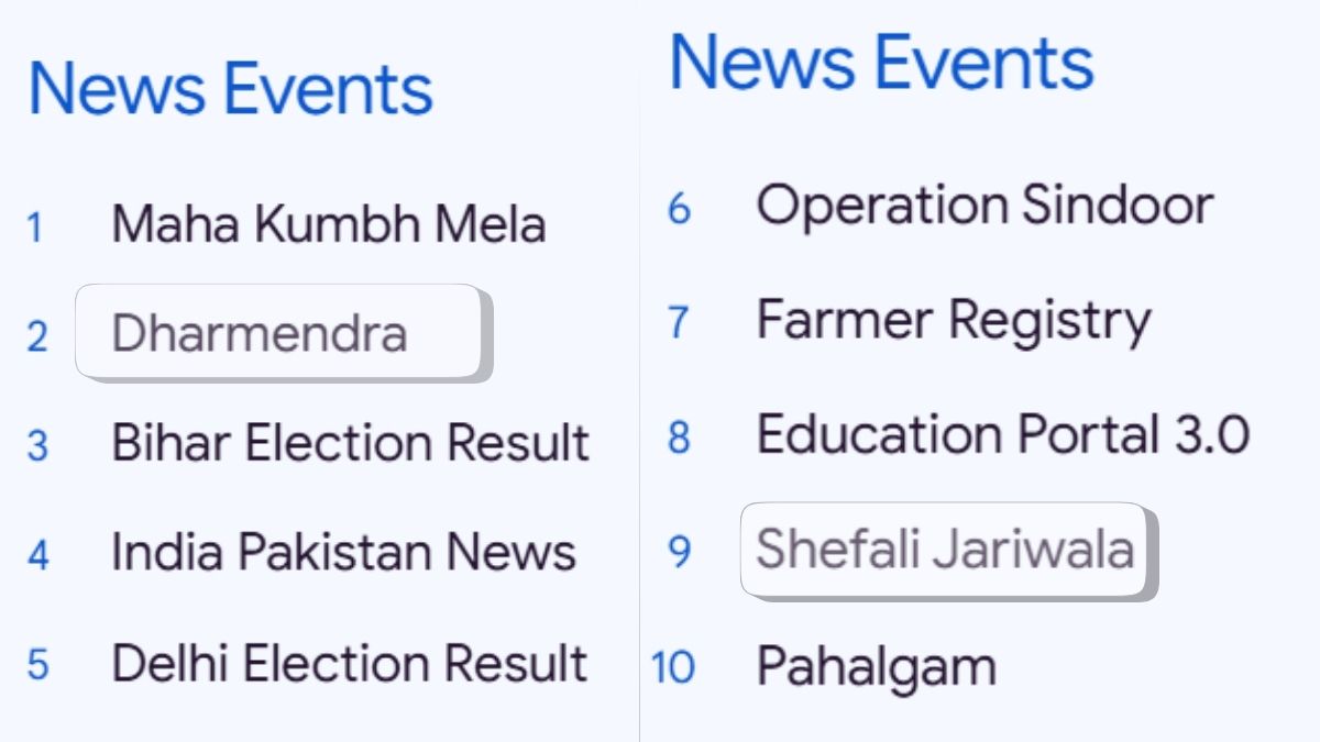 न्यूज इवेंट कैटेगरी में टॉप ट्रेंड में कुछ बड़ी घटनाएं शामिल हैं, जिनके बीच फिल्म इंडस्ट्री के ये नाम तैरते रहे। गूगल की ओर से जारी 2025 के टॉप ट्रेंड्स में महाकुम्भ मेला पहले पायदान पर है, जबकि धर्मेंद्र दूसरे नम्बर पर हैं। शेफाली जरीवाला का नाम नौवें स्थान पर है।