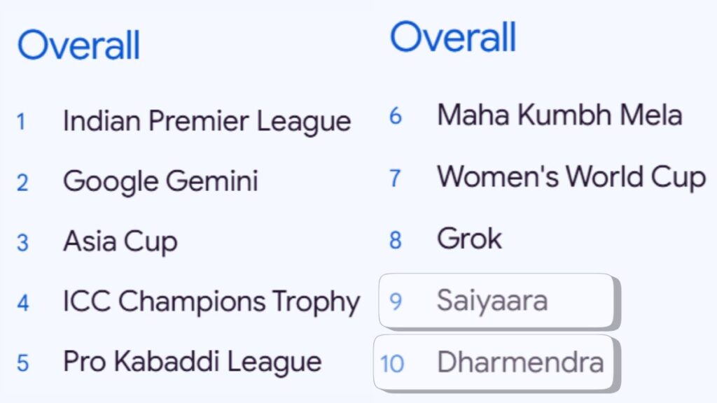 गूगल ने कैटेगरी वाइज टॉप ट्रेंड के साथ ओवरऑल ट्रेंड्स की लिस्ट भी जारी की है, जिसमें सैयारा नौवें और धर्मेंद्र का नाम 10वें पायदान पर है। ओवरऑल ट्रेंड में ज्यादातर टॉप ट्रेंड्स खेलों से जुड़े हैं।