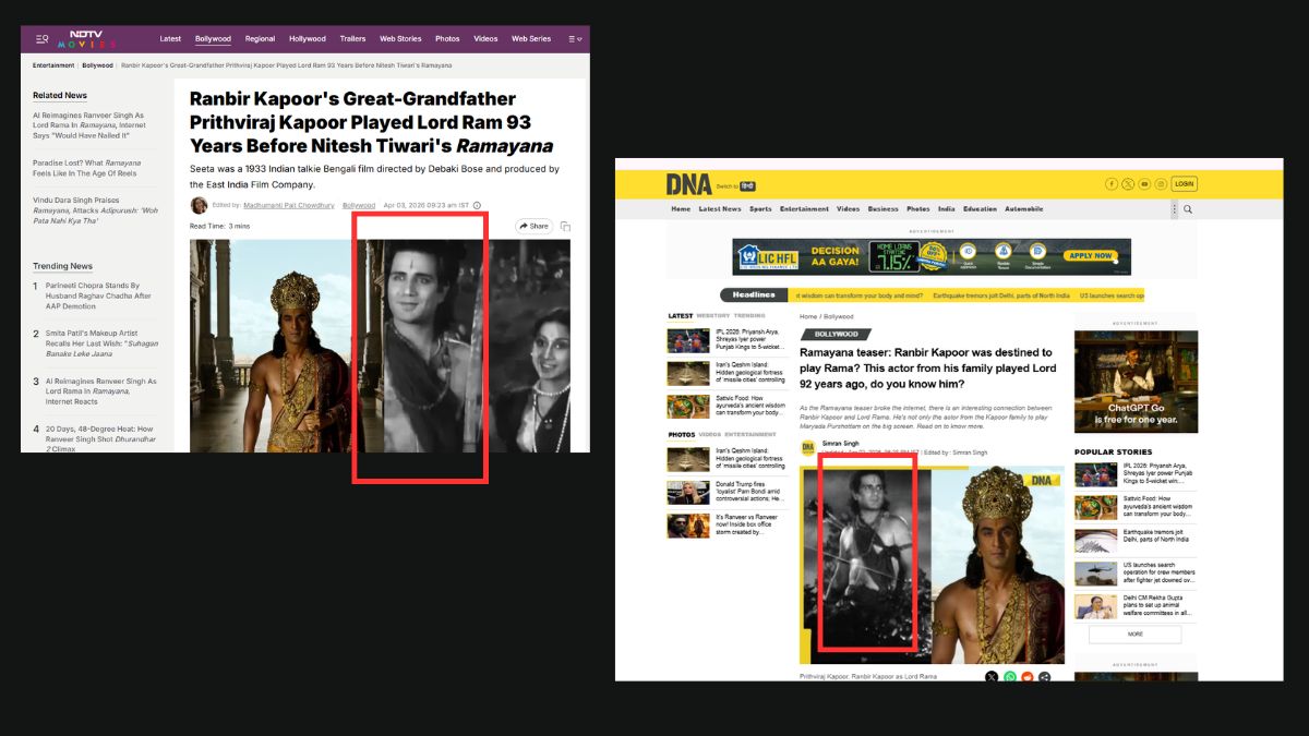 पृथ्वीराज कपूर ने 1933 में आई फिल्म सीता में भगवान राम का किरदार निभाया था, जिसे देबकी बोस ने निर्देशित किया था। इसी स्टोरी को कई वेबसाइट्स ने छापा, मगर गलत फोटो के साथ। खबर देने की आपाधापी ने किसी ने इस तथ्य की जांच करने की जहमत नहीं उठाई। बड़ी-बड़ी वेबसाइट्स ने उसी फोटो का इस्तेमाल किया।