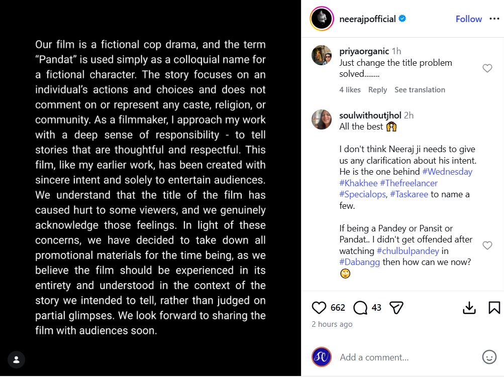 शुक्रवार को इंस्टाग्राम पर साझा किये गये स्टेटमेंट में नीरज ने कहा- हमारी फिल्म एक फिक्शनल कॉप ड्रामा है और पंडत शब्द का इस्तेमाल एक किरदार को लेकर अनौपचारिक बातचीत के लिए किया गया है। कहानी एक व्यक्ति के कर्मों और फैसलों को दिखाती है और किसी जाति, धर्म या समुदाय पर टिप्पणी नहीं करती, ना ही उसका प्रतिनिधित्व करती है।