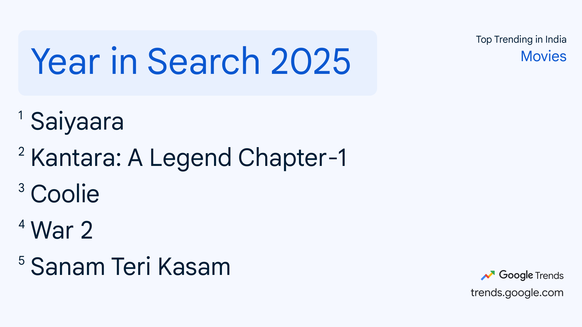 इस लिस्ट में टॉप पर सैयारा है, जो साल की तीसरी सबसे अधिक कमाई करने वाली फिल्म है। वहीं, कुछ नाम ऐसे हैं, जिन्हें सर्च लिस्ट में देखकर आप चौंक जाएंगे।