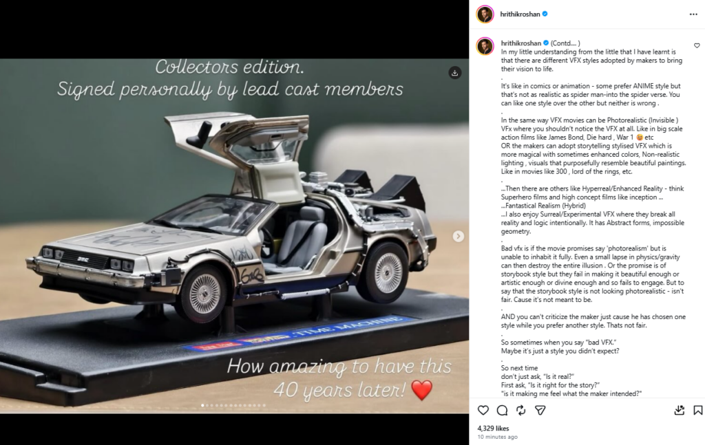 ऋतिक ने आगे लिखा कि मुझे वीएफएक्स की जो थोड़ी-बहुत जानकारी है, उसके अनुसार हर फिल्ममेकर अपने विजन को दिखाने के लिए अलग-अलग तरह के वीएफएक्स का इस्तेमाल करता है।