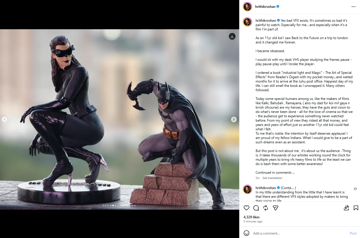ऋतिक ने आगे लिखा कि मुझे वीएफएक्स की जो थोड़ी-बहुत जानकारी है, उसके अनुसार हर फिल्ममेकर अपने विजन को दिखाने के लिए अलग-अलग तरह के वीएफएक्स का इस्तेमाल करता है।