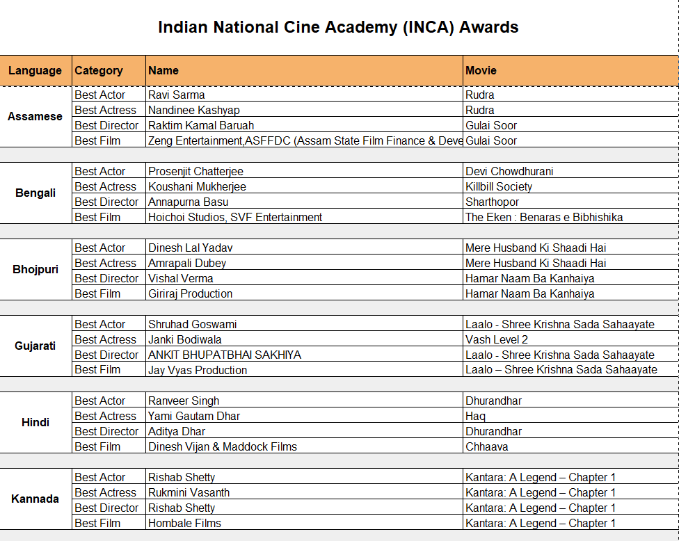 इंका अवॉर्ड्स की चार प्रमुख कैटेगरीज (बेस्ट एक्टर, बेस्ट एक्ट्रेस, बेस्ट डायरेक्टर और बेस्ट फिल्म) में 12 भाषाओं के विजेताओं की लिस्ट इस प्रकार है: