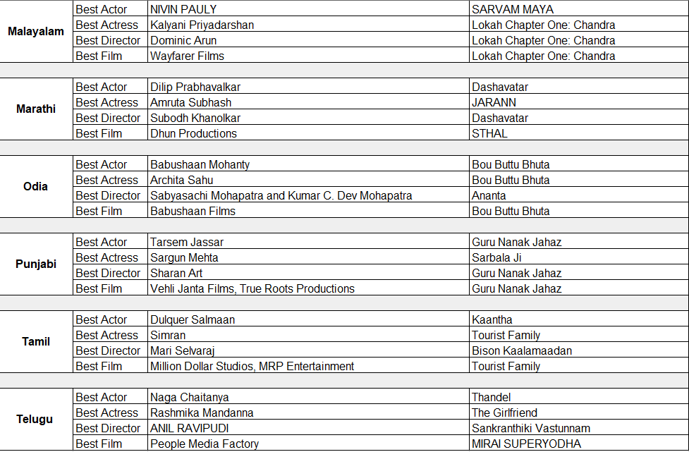 उपरोक्त चार मुख्य कैटेगरीज के अलावा अन्य सहयोगी और तकनीकी कैटेगरीज के विजेताओं का चुनाव सभी भाषाओं की फिल्मों के आधार पर किया गया है, यानी इन कैटेगरीज में सभी 12 भाषाओं की फिल्मों ने कॉम्पीट किया है। इनकी लिस्ट इस प्रकार है: