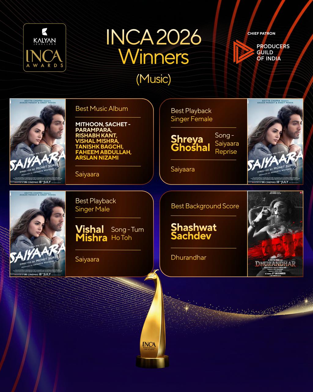 मुंबई। INCA Awards 2026: इंडियन नेशनल सिने एकेडमी ने अपने पहले अवॉर्ड समारोह के विजेताओं का एलान कर दिया है, जिसमें धुरंधर और सैयारा ने सबसे ज्यादा अवॉर्ड्स हासिल किये हैं।