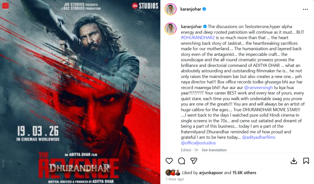बता दें, करण जौहर की यह पोस्ट ऐसे समय में आई है, जब बॉलीवुड पर आदित्य धर को अलग-थलग कर देने के आरोप लगाये जा रहे हैं। सोशल मीडिया में अक्सर यह सवाल उठाया जाता है कि साउथ के तमाम कलाकारों ने धुरंधर 2 की तारीफ में पोस्ट लिखी हैं, मगर बॉलीवुड के दिग्गज खामोश हैं।