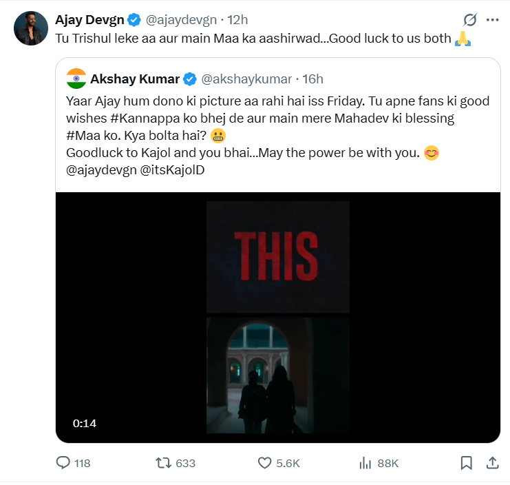 मंगलवार को अक्षय ने मां का टीजर शेयर करके अजय के नाम संदेश लिखा- ”यार अजय हम दोनों की पिक्चर आ रह है इस फ्राइडे। तू अपने फैंस की गुड विशेज कन्नप्पा को भेज दे और मैं मेरे महादेव की ब्लेसिंग मां को। क्या बोलता है? गुडलक टू काजोर और मेरे भाई तुझे। भगवान करे, सफलता मिले। अक्षय ने अजय और काजोल, दोनों को अपनी पोस्ट में टैग किया है।”