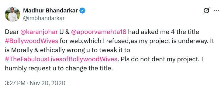 मधुर भंडारकर ने एक्स पर लिखा था- प्रिय करण जौहर और अपूर्व मेहता ने मुझसे वेब के लिए बॉलवुड वाइव्स टाइटल मांगा था, जिससे मैंने इनकार कर दिया, क्योंकि मेरा प्रोजेक्ट निर्माणाधीन है। यह नैतिक और सैद्धांतिक रूप से गलत है कि आपने टाइटल को द फेबुलस लाइव्स ऑफ बॉलीवुड वाइव्स करके इस्तेमाल कर लिया। कृपया, मेरे प्रोजेक्ट को बर्बाद मत कीजिए। मेरा आपसे विनम्र निवेदन है कि टाइटल बदल दीजिए।