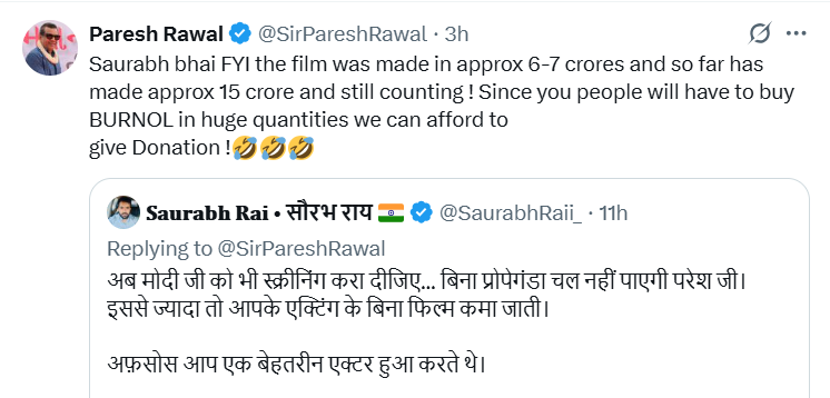 मुंबई। Paresh Rawal Trolled: एक बेहतरीन अभिनेता से ट्रोल बने परेश रावल ने एक सोशल मीडिया यूजर को उसी की भाषा में जवाब दिया है। यूजर ने द ताज स्टोरी के बॉक्स ऑफिस कलेक्शंस को लेकर तंज कसा, जिसके बाद परेश रावल ने उससे कहा कि कलेक्शंस देखने के बाद बरनॉल की जरूरत पड़ेगी।