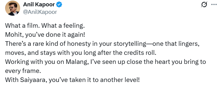 मोहित सूरी के साथ मलंग में काम कर चुके अनिल कपूर ने लिखा- क्या फिल्म है। क्या फीलिंग है। मोहित, तुमने फिर कर दिखाया। तुम्हारे कहानी कहने के अंदाज में एक दुर्लभ ईमानादारी छिपी है, जिसका सुरूर चढ़ता है और क्रेडिट रोल के बाद लम्बे अर्से तक साथ रहती है।