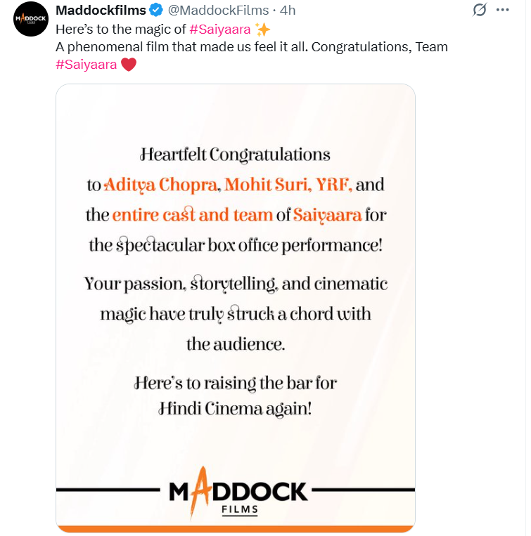 इस साल छावा जैसी बेहद कामयाब फिल्म देने वाले मैडॉक फिल्म्स ने यशराज फिल्म्स को सैयारा के लिए बधाई दी। कम्पनी के एक्स हैंडल से एक नोट साझा किया गया, जिसमें लिखा है- आदित्य चोपड़ा, मोहित सूरी, वायआरएफ और सैयारा की पूरी कास्ट और टीम को दिली शुभकामनाएं।