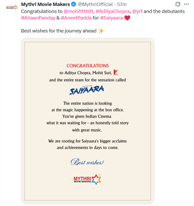 पिछले साल पुष्पा 2 जैसी ब्लॉकबस्टर फिल्म के निर्माता मैत्री मूवी मेकर्स ने एक्स पर लिखा- आदित्य चोपड़ा, मोहित सूरी, वायआरएफ और टीम को इस सेंसेशन के लिए बधाई, जिसका नाम है सैयारा। पूरा देश बॉक्स ऑफिस पर चल रहे जादू को देख रहा है। आपने भारतीय सिनेमा को वो दिया है, जिसका इंतजार था- एक ईमानदारी से बताई गई कहानी, साथ में महान संगीत।