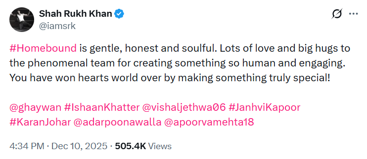 अब फिल्म को शाह रुख खान का साथ मिला है, जिन्होंने फिल्म की तारीफ में बुधवार को एक पोस्ट एक्स पर लिखी, जिसमें उन्होंने कहा- होमबाउंड एक सरल, ईमानदार और रूहानी फिल्म है। ऐसी फिल्म बनाने के लिए इसकी टीम को बहुत प्यार, जो मानवीय होने के साथ इंगेजिंग भी है।