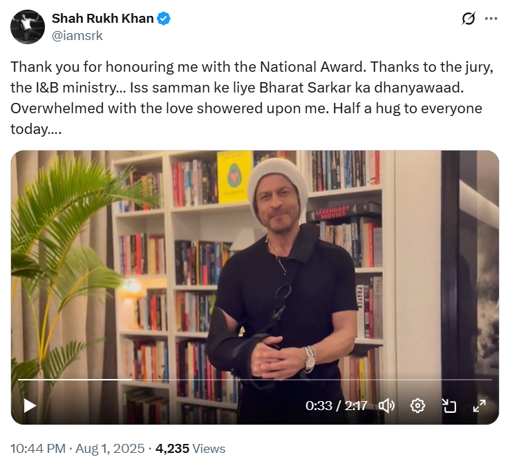 शाह रुख ने इस वीडियो के साथ लिखा नेशनल अवॉर्ड मुझे देने के लिए शुक्रिया। ज्यूरी, आइ एंड बी मिनिस्ट्री और भारत सरकार का इस सम्मान के लिए धन्यवाद। मुझ पर जो प्यार दिखाया है, उससे अभिभूत हूं। सभी को आधा हग।