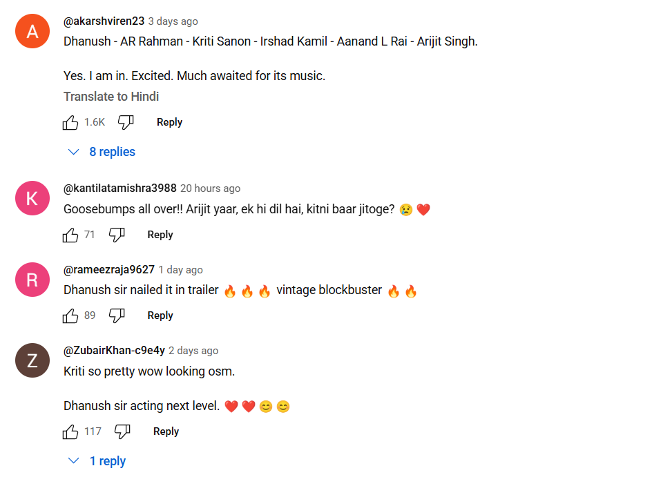 कई यूजर्स ने टीजर की तारीफ की है और इसे साल के सबसे अच्छे टीजर्स में से एक बताया है। खासकर, धनुष का अंदाज उन्हें लुभा रहा है और फिल्म के लिए बेकरारी बढ़ा रहा है। कृति सेनन के साथ उनकी केमिस्ट्री देखने का इंतजार भी यूजर्स को है।
