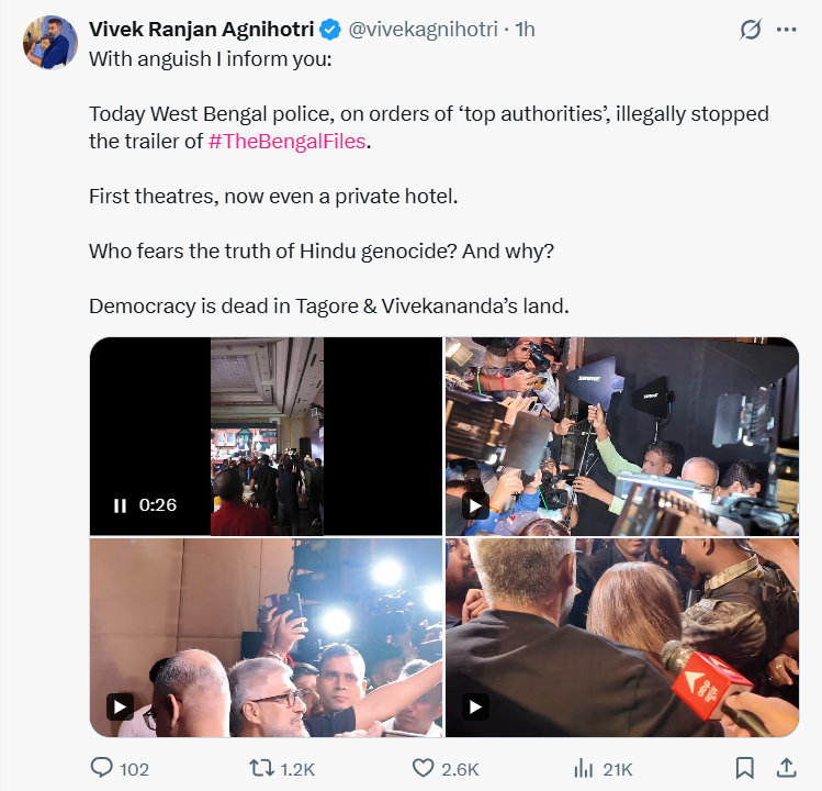 शनिवार को विवेक ने एक्स पर वीडियो के जरिए बताया था कि उनके ट्रेलर लॉन्च का वेन्यु कैंसिल कर दिया गया है। ट्रेलर पहले सिनेमाहॉल में रिलीज होना था, मगर उसे कैंसिल कर दिया गया था। हालांकि, उन्होंने कहा था कि हर हाल में कोलकाता में ही ट्रेलर लॉन्च करेंगे, क्योंकि यह डायरेक्टर एक्शन डे की घटना पर बनी फिल्म है।