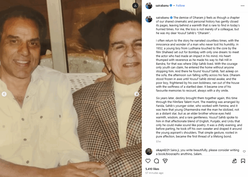 धर्मेंद्र के निधन के बाद सायरा बानो ने दिलीप साहब से उनकी मुलाकात का किस्सा इंस्टाग्राम पर शेयर किया है। सोमवार को सायरा धर्मेंद्र को अंतिम विदाई देने श्मशान भूमि भी पहुंची थीं। सायरा ने लिखा- धरम जी के निधन से ऐसा लगा कि हमारे साझा सिनेमाई और निजी इतिहास का एक अध्याय बंद हो गया, मगर अपने पीछे ऐसी गरमाहट छोड़ गया है, जो आज के समय में दुर्लभ है। मेरे लिए, उनका जाना सिर्फ एक सहकर्मी का जाना नहीं है, वो मेरे प्यारे यूसुफ साहब के धरम थे।