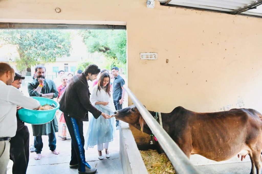 मथुरा की गऊशाला में सिद्धार्थ गुप्ता के साथ संस्कृति। फोटो- फिल्म पीआर