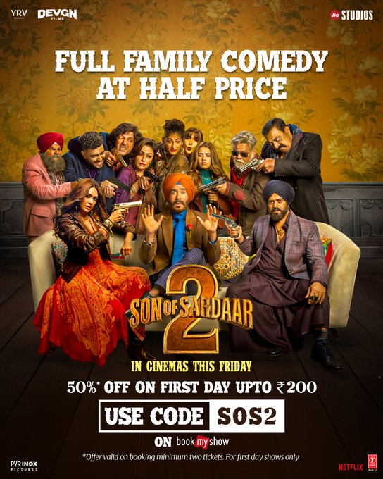 ‘सन ऑफ सरदार 2’ पर पहले दिन BOGO ऑफर दिया जा रहा है, यानी एक टिकट खरीदने पर दूसरा मुफ्त मिलेगा। हालांकि, इस ऑफर के तहत अधिकतम 200 रुपये की छूट ही दी जाएगी। ज्यादा जानकारी के लिए बुक माइ शो वेबसाइट पर जा सकते हैं।