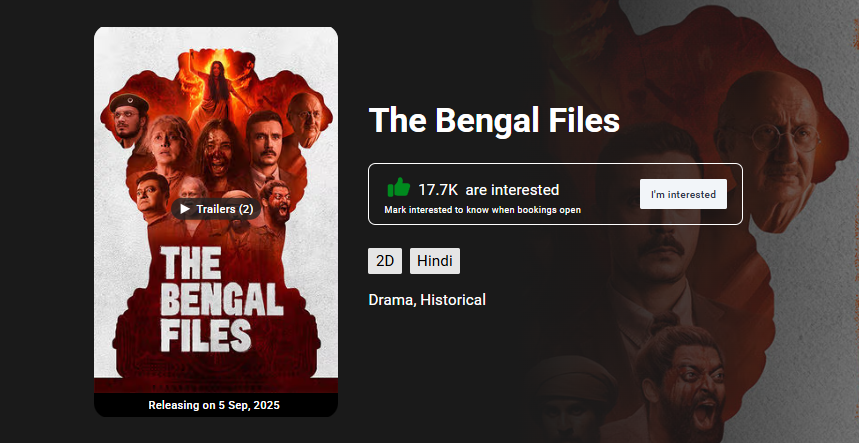 दूसरी ओर, विवेक अग्निहोत्री की फाइल्स ट्रिलॉजी की आखिरी फिल्म द बंगाल फाइल्स को लेकर सिर्फ 17 हजार से कुछ ज्यादा दर्शकों ने ही इंटरेस्ट जाहिर किया है। यह फिल्म 1946 में कोलकाता में मुस्लिम लीग के आह्वान पर आयोजित डायरेक्ट एक्शन डे की घटना को दिखाती है। इस दौरान कोलकाता में जबरदस्त दंगे हुए थे और बड़ी तादाद में हिंदुओं को कत्ल किया गया था।