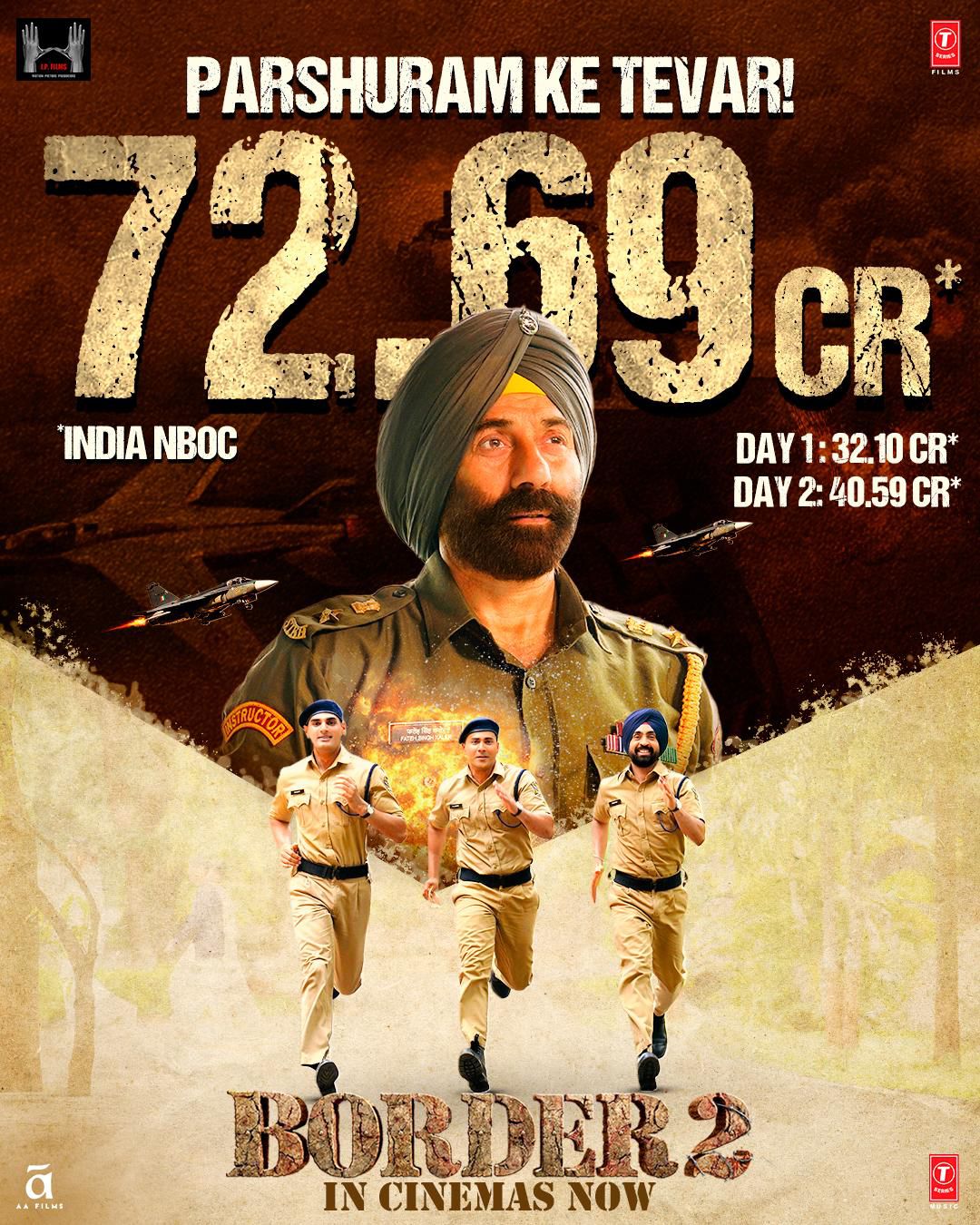 23 जनवरी (शुक्रवार) को रिलीज हुई फिल्म ने 32.10 करोड़ की ओपनिंग ली थी और दूसरे दिन शनिवार को कलेक्शंस में जबरदस्त जम्प आया और बॉर्डर ने 40.59 करोड़ का नेट कलेक्शन किया। घरेलू बॉक्स ऑफिस पर बॉर्डर 2 का दो दिनों का नेट कलेक्शन अब 72.69 करोड़ हो गया है।