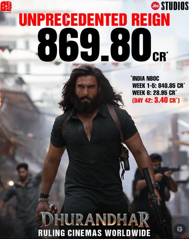 गुरुवार को धुरंधर ने रिलीज का छठा हफ्ता पूरा किया और कलेक्शन रहा 3.40 करोड़, जिसके बाद घरेलू बॉक्स ऑफिस पर इसका छह हफ्तों या 42 दिनों का नेट कलेक्शन ₹869.80 करोड़ हो गया है। धुरंधर ने छठे हफ्ते में ₹28.95 करोड़ का नेट कलेक्शन किया।