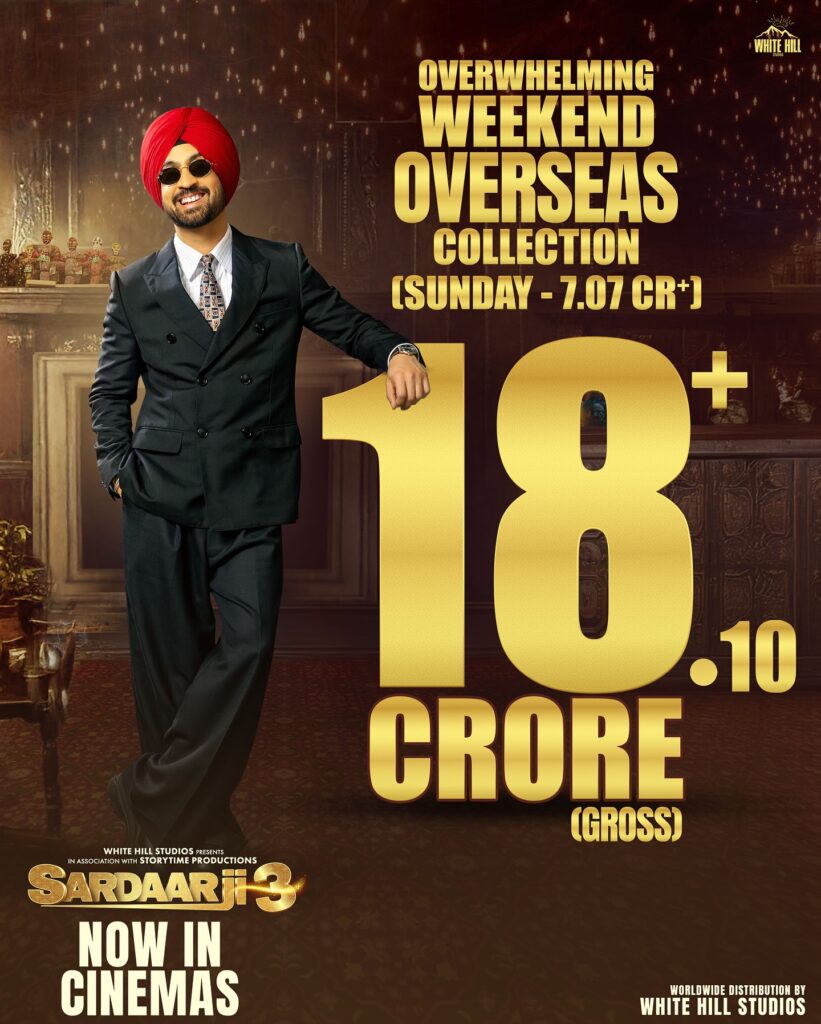 दिलजीत दोसांझ की टीम ने ओवरसीज की कमाई के जो आंकड़े शेयर किये हैं, उनके मुताबिक सरदार जी 3 ने ओवरसीज में 18.10 करोड़ का ग्रॉस कलेक्शन किया है। रविवार को फिल्म ने 7.07 करोड़ ग्रॉस कलेक्शन ओवरसीज में किया।