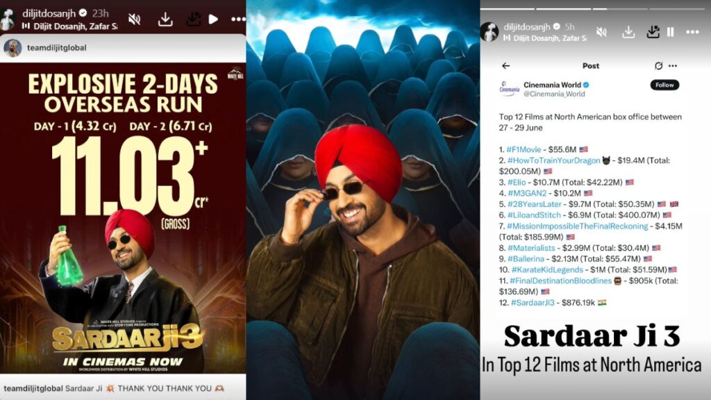 मुंबई। Sardar Ji 3 Box Office: दिलजीत दोसांझ की हॉरर कॉमेडी फिल्म सरदार जी 3 भारत में रिलीज नहीं की गई है, मगर ओवरसीज में फिल्म छप्परफाड़ कमाई कर रही है, जिसके चलते ओपनिंग वीकेंड में फिल्म ने बॉक्स ऑफिस पर पैसों की बारिश कर दी है।