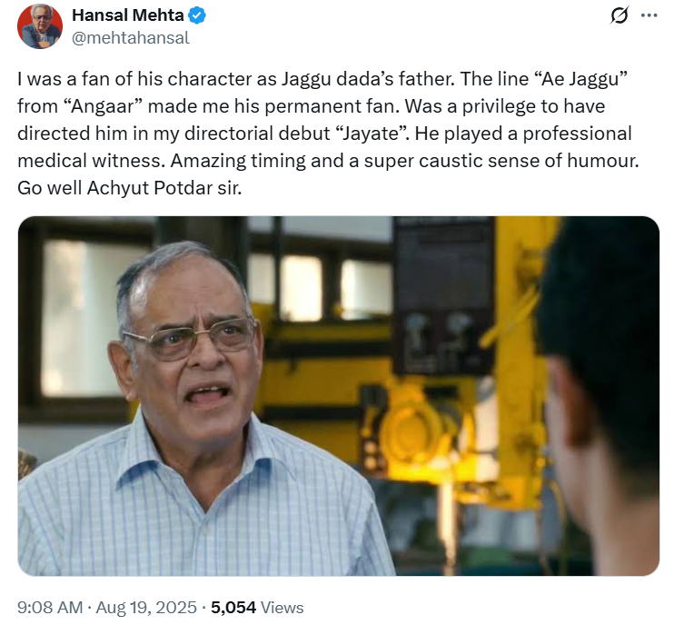 हंसल ने लिखा- मैं जग्गू दादा के पिता के किरदार के लिए उनका फैन था। अंगार में वो जिस तरह कहते थे- ए जग्गू, उससे मैंं उनका फैन बन गया। उन्हें अपनी डेब्यू फिल्म जयते में निर्देशित करने का मुझे सौभाग्य मिला। उन्होंने प्रोफेशनल मेडिकल गवाह का रोल निभाया था। जबरदस्त टाइमिंग और ह्यूमर। अच्युत पोतदार सर, अच्छे से सफर कीजिए।