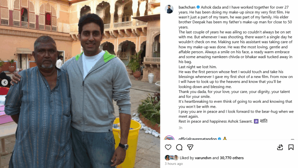 अभिषेक ने सोशल मीडिया में एक भावुक नोट लिखकर दिवंगत अशोक सावंत को याद किया और अपने करियर में उनकी मौजूदगी को रेखांकित किया। अशोक, अमिताभ बच्चन के मेकअप मैन दीपक सावंत के छोटे भाई थे।