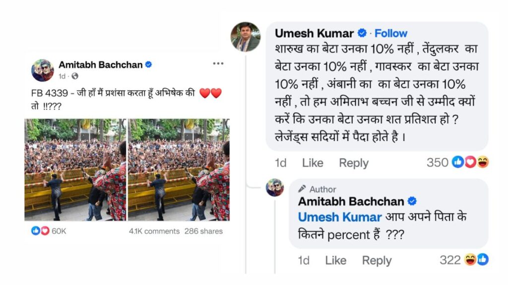 अमिताभ की इस पोस्ट पर हजारों कमेंट्स आये हैं। कमाल की बात बिग ने कई के जवाब भी दिये हैंं। उमेश कुमार नाम के एक यूजर ने कमेंट सेक्शन में लिखा- शाह रुख का बेटा उनका 10 फीसदी नहीं, तेंदुलकर का बेटा उनका 10 फीसदी नहीं, गावस्कर का बेटा उनका 10 फीसदी नहीं, अंबानी का बेटा उनका 10 फीसदी नहीं तो हम अमिताभ बच्चन जी से उम्मीद क्यों करें कि उनका बेटा उनका शत-प्रतिशत हो? लीजेंड्स सदियों में पैदा होते हैं।