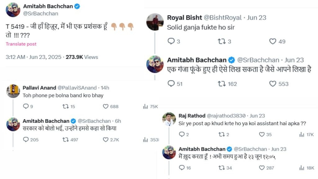 नीचे दिये गये स्क्रीनशॉट्स में बिग बी के जवाब पढ़िए, आपको अंदाजा हो जाएगा कि अमिताभ ट्रोल बैक करने में पीछे नहीं हैं। एक यूजर के जहन में यह सवाल उठा भी कि एक्स पर पोस्ट बिग बी खुद लिखते हैं या कोई और? अमिताभ ने इस शंका का समाधान खुद कर दिया।