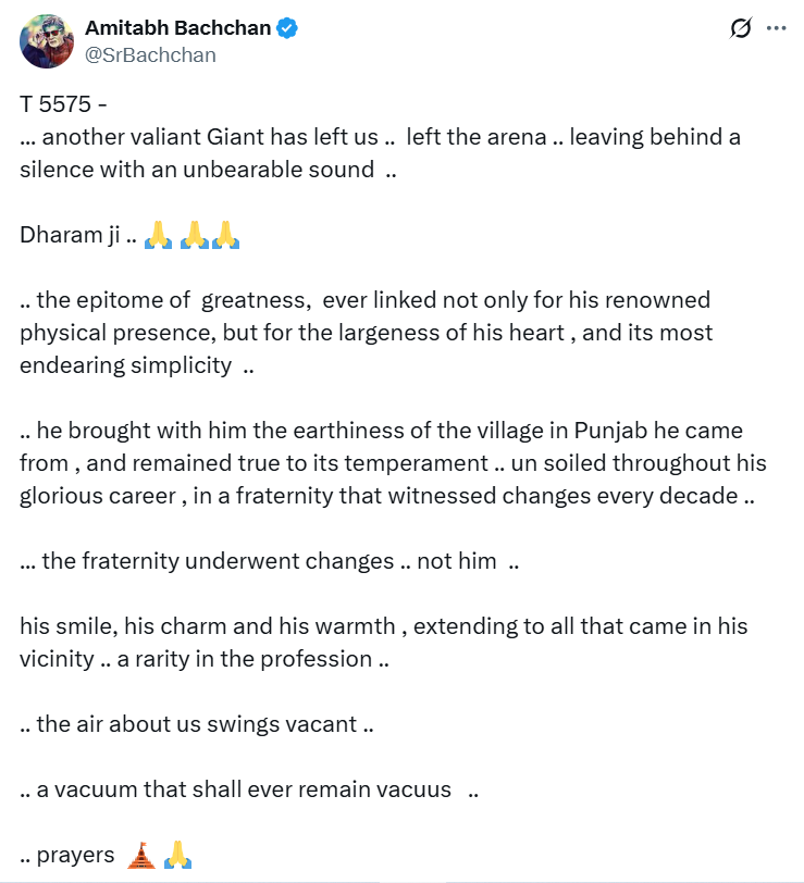 देर रात अमिताभ ने एक्स पर धर्मेंद्र को याद करते हुए भावुक पोस्ट लिखी- एक और निर्भीक विशालकाय व्यक्तित्व हमें छोड़कर चला गया। अखाड़ा छोड़कर चला गया। अपने पीछे असहनीय आवाज की शांति। धरम जी।