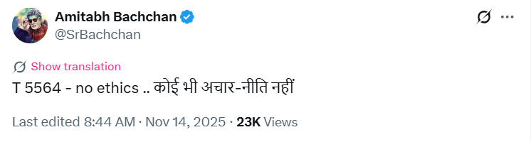 इस बीच धर्मेंद्र के जोड़ीदार अमिताभ बच्चन ने एक्स पर एक संदेश लिखा है, जिसे मौजूदा परिप्रेक्ष्य में देखा जा रहा है। शोले के जय ने लिखा- नो एथिक्स… कोई आचार-नीति नहीं।