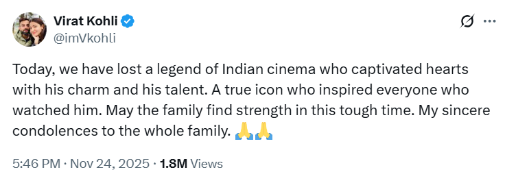 क्रिकेटर विराट कोहली ने एक्स पर लिखा- आज, आज हमने भारतीय सिनेमा का ऐसा सितारा खो दिया, जिसने अपने चार्म और टैलेंट से दिलों को जकड़कर रखा। एक सच्चे आइकॉन, जिसने हर देखने वाले को प्रेरित किया। इस मुश्किल घड़ी में परिवार को शक्ति मिले। पूरे परिवार के लिए मेरी गहन संवेदनाएं।