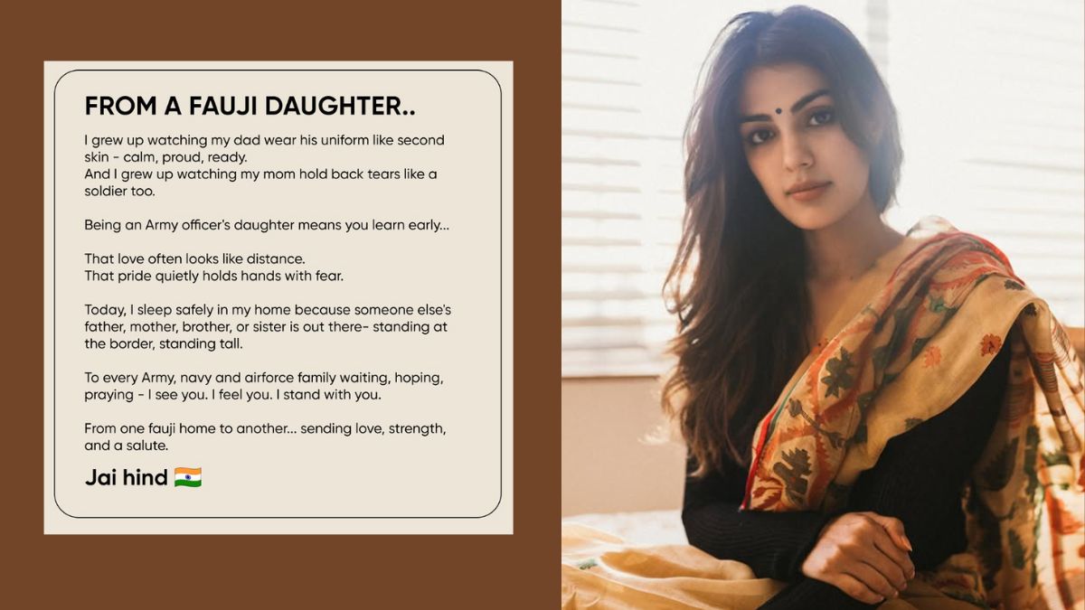 अब बॉलीवुड एक्ट्रेस रिया चक्रवर्ती ने इंस्टाग्राम पोस्ट के जरिए भारतीय सेना की तारीफ की है। उन्होंने इस पोस्ट में खुद को फौजी की बेटी कहा है। बता दें, रिया के पिता भारतीय सेना में लेफ्टिनेंट कर्नल थे।