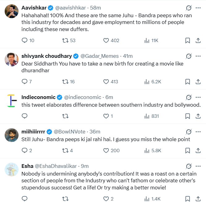 एक अन्य यूजर ने लिखा- प्यारे सिद्धार्थ, धुरंधर जैसी फिल्म बनाने के लिए आपको नया जन्म लेना होगा। एक और यूजर ने लिखा- यह ट्वीट साउथ इंडस्ट्री और बॉलीवुड के बीच फर्क बताता है। एक और फॉलोअर ने लिखा कि कोई किसी के योगदान को कम नहीं कर रहा है। यह इंडस्ट्री के ऐसे लोगों के लिए रोस्ट सेक्शन था, जो दूसरों की बड़ी सफलता को भी सेलिब्रेट नहीं कर सकते। कुछ काम करो और बेहतर फिल्में बनाओ।