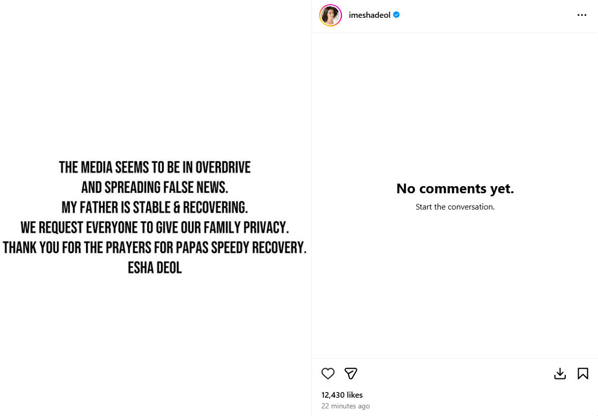 एशा ने इंस्टाग्राम पर लिखा- “लगता है, मीडिया कुछ ज्यादा ही काम कर रही है और गलत खबरें फैला रही है। मेरे पिता स्थिर हैं और रिकवर कर रहे हैं। हम हर किसी से गुजारिश करते हैं कि परिवार की निजता का सम्मान करें और जल्द ठीक होने की दुआ करें।”