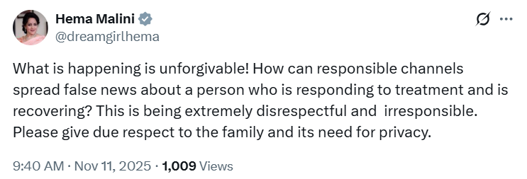 हेमा मालिनी ने लिखा- “जो हो रहा है वो अक्षम्य है। जिम्मेदार चैनल कैसे एक व्यक्ति के बारे में झूठी खबर फैला सकते हैं, जो ट्रीटमेंट से ठीक हो रहे हैं? यह बेहद अपमानजनक और गैरजिम्मेदाराना है। कृपया, परिवार का सम्मान कीजिए। इसे निजता की जरूरत है।”