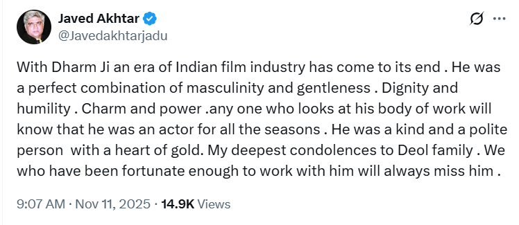 वेटरन राइटर जावेद अख्तर ने मंगलवार सुबह जब एक्स पर धर्मेंद्र को श्रद्धांजलि दी तो संदेह की कोई गुंजाइश नहीं रही। उन्होंने लिखा- “धरम जी के साथ भारतीय फिल्म इंडस्ट्री का एक अध्याय समाप्त हो गया। वो मर्दानगी और कोमलता का परफेक्ट कॉम्बिनेशन थे। गरिमा और विनम्रता। आकर्षण और ताकत। कोई भी उनके काम को देखकर यही कहेगा कि वो हर सीजन के अभिनेता था।