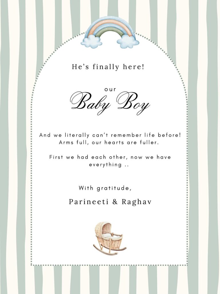 परिणीति और राघव ने 19 अक्टूबर को सोशल मीडिया के जरिए खबर दी थी कि उनके घर बेटे का जन्म हुआ है। सोशल मीडिया पोस्ट में कपल ने लिखा था- आखिरकार, वो आ गया- हमारे बेबी ब्वॉय। अब हमें वाकई अपनी पहले वाली जिंदगी बिल्कुल याद नहीं है। हमारे बाहें भरी हुई हैं और दिल उससे ज्यादा भर गये हैं।