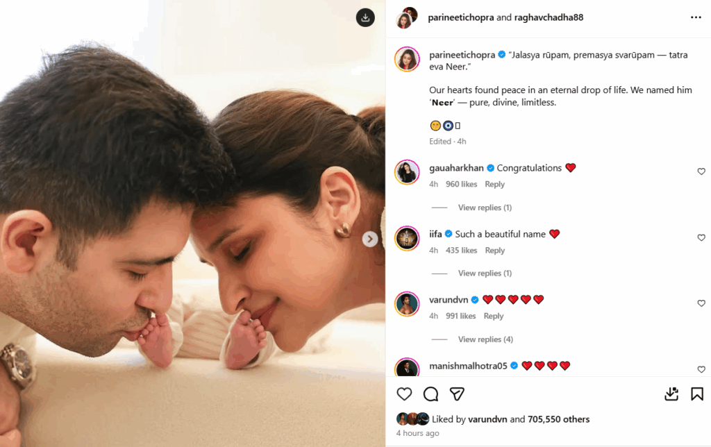 सोशल मीडिया प्लेटफॉर्म पर परिणीति दो फोटो पोस्ट कीं, जिनमें दोनों नवजात के नन्हे पैरों का चूम रहे हैं। इस फोटो के साथ उन्होंने कैप्शन लिखा- जलस्य रूपम, प्रेमस्य स्रूपम। तत्र एवा नीर। हमारे जीवन की शाश्वत बूंद के आने से हमारे दिलों को सुकून मिला है।